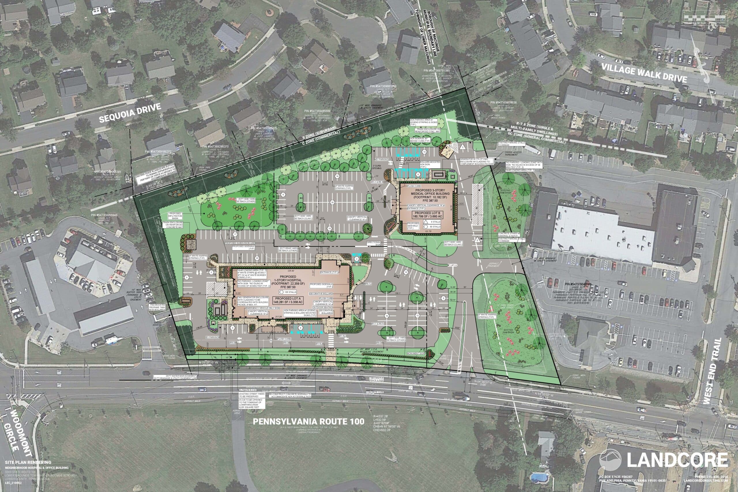 Small “micro-hospital” capable of treating/stabilizing trauma and arrange for transport to regional hospital as appropriate. MOB to be rented out to various medical professionals. Formerly the old Weis Super Market which has since moved across the street. Landcore and the Developer worked closely with the Township of Lower Macungie to address buffering concerns from adjacent residents.